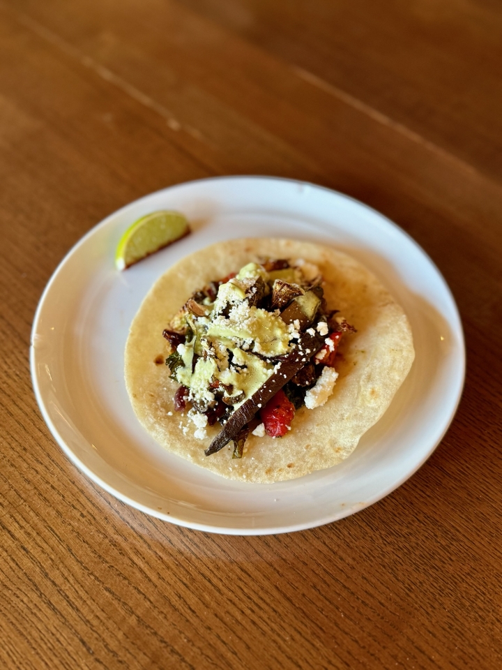 Mushrooms, roasted red peppers, grilled red onions, fried brussels sprouts, corn pico, queso fresco, creamy serrano