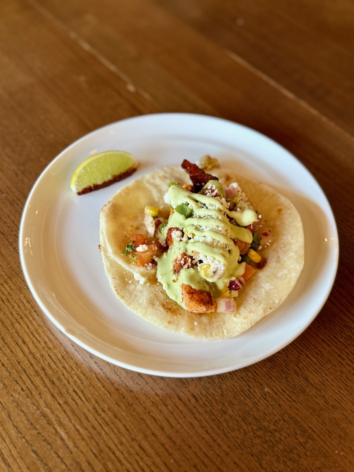 Blackened salmon, corn pico, queso fresco, creamy serrano